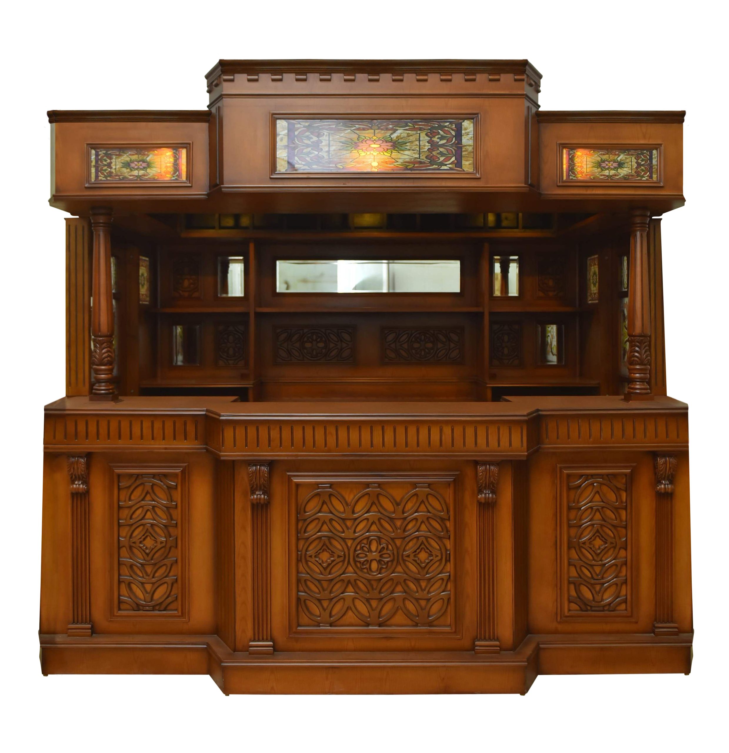 A taste of merry Old England and a hint of the era of empires find themselves in this bar made of high quality oak wood. Decorative elements include a canopy, stained glass, a sink cabinet and carved columns. This bar is perfect for cocktail parties or intimate gatherings.