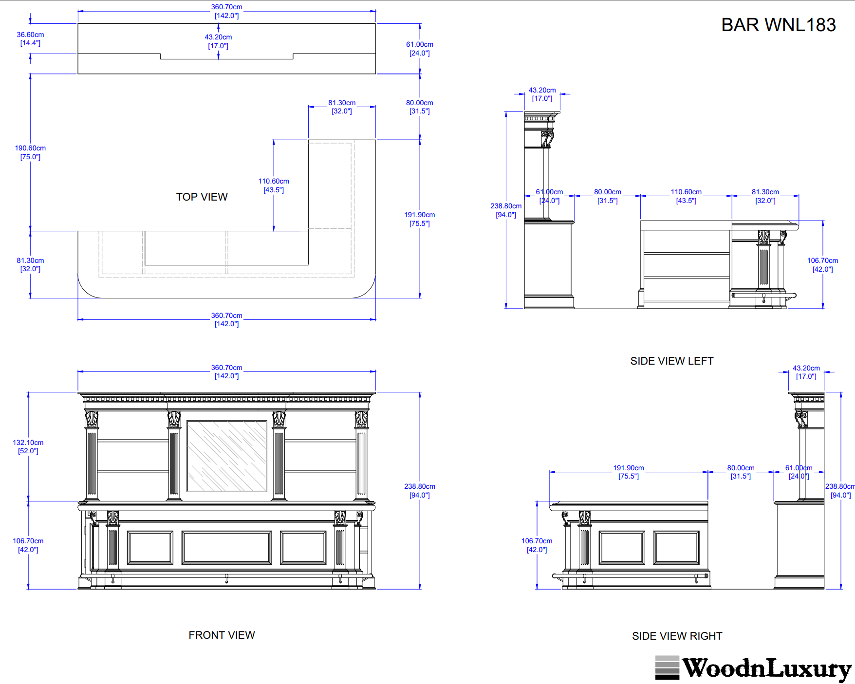 Establish a commanding presence in your home or commercial space with this full-scale black bar set, a true embodiment of timeless executive elegance. Make use of the expansive serving counter and your guests will enjoy a premium experience in comfort as they are presented with a polished brass foot rail. The impressive back bar reflects this grandeur, offering a vast, mirrored surface flanked by integrated glass shelving and handsome columns, providing a magnificent backdrop for your entire liquor collection. This bar is designed for the real host, delivering unmatched style, storage, and professional-grade hosting capability.
